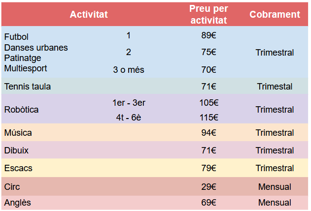 - El pagament de les activitats extraescolars també serà trimestral, a través de rebut domiciliat i s’abonarà els mesos d’octubre, gener i abril.