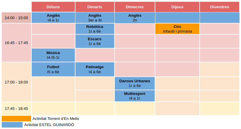 - El servei d’extraescolars s’iniciarà del 29 de setembre fins el 29 de maig (coincidint amb l’inici de la jornada intensiva escolar).